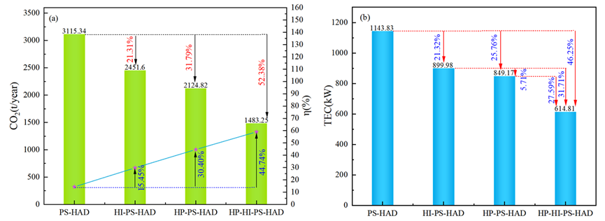 Fig. 2. (a) Comparison of CO2 and η indicators under different schemes (b) Comparison of TEC indicators under different schemes